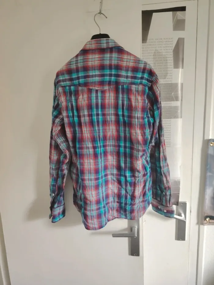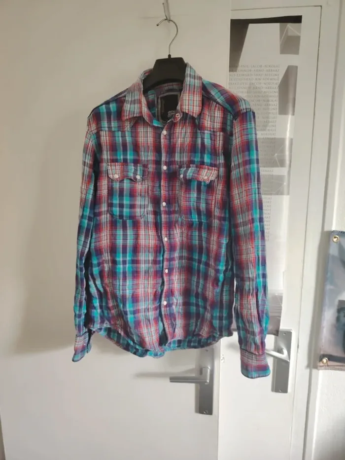 #meganeayronhommes Chemise manche longue bleu à carreaux rouge marque Jack & Jones taille S 1 pression de casser