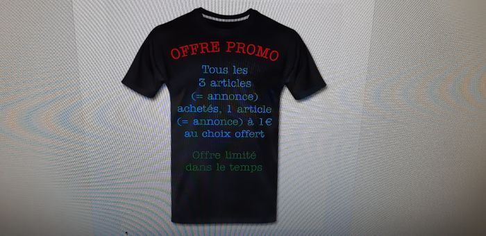 Offre promo : Vous acheter 3 articles dans mon dressing, et vous pouvez rajouter 1 article à 1€ au choix dans votre panier. Me demander si vous êtes intéressé. (Cette annonce n'est pas à vendre).