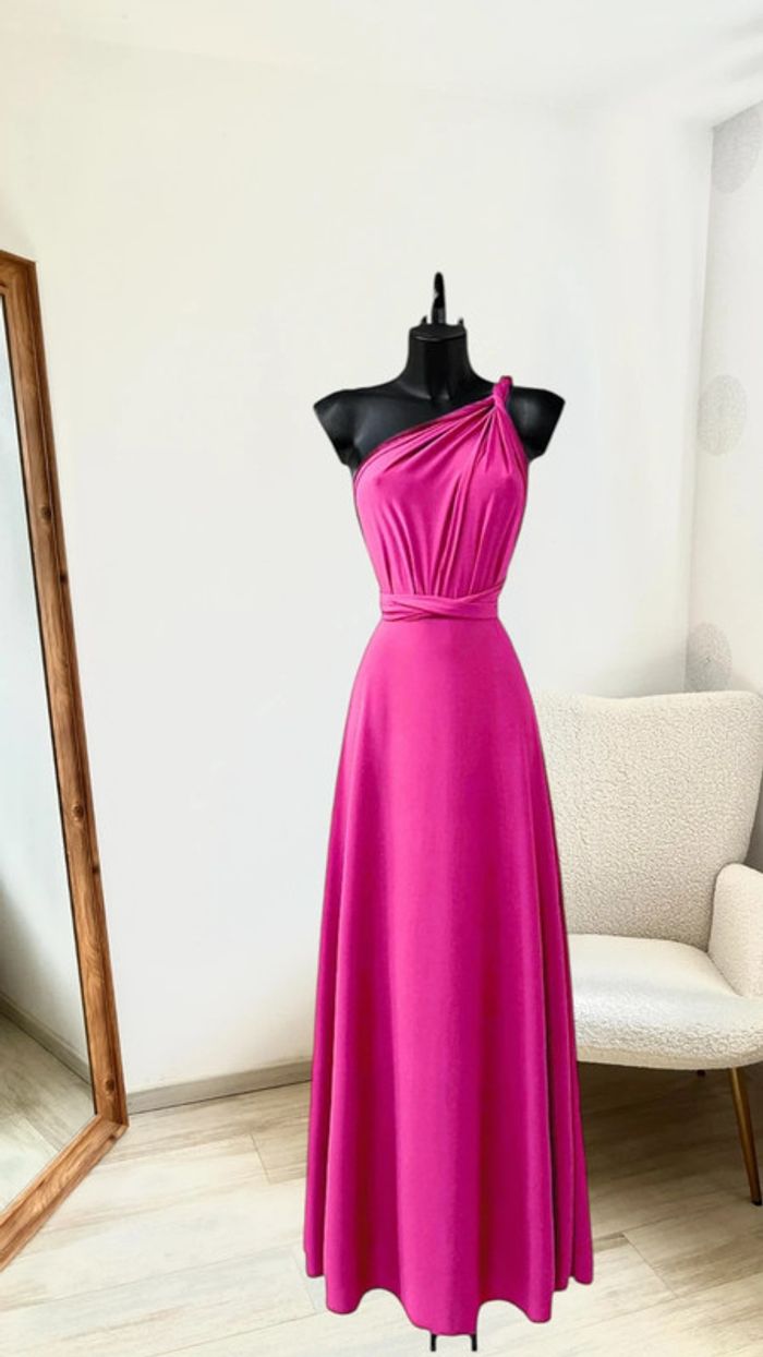 Robe rose fuchsia plusieurs positions possibles dos nu