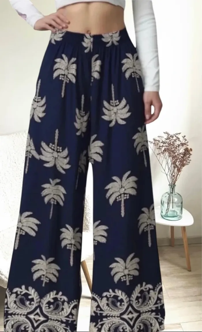Magnifique pantalon à jambes larges bleu marine et palmiers