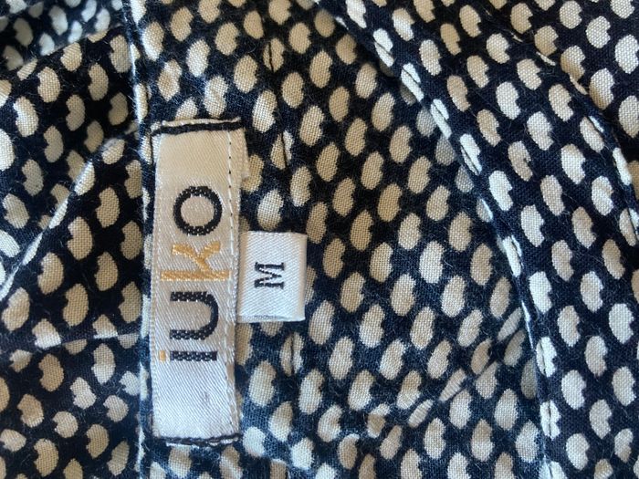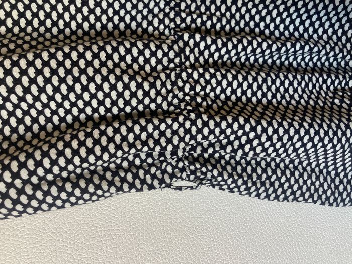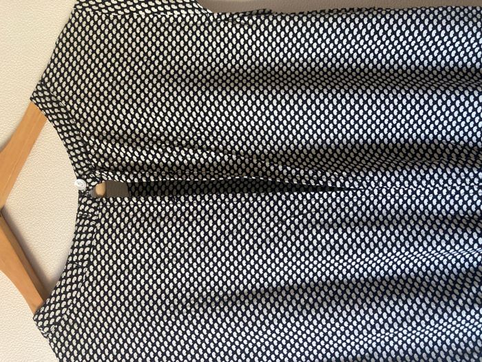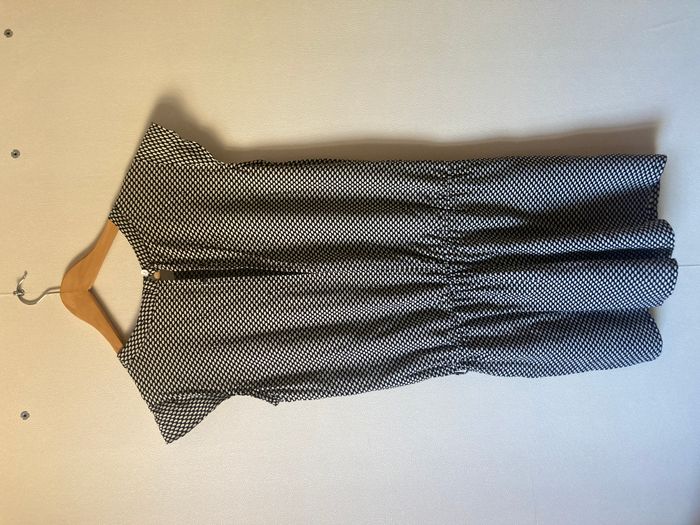 taille M fendu sur 28 cm dans le dos largeur d'aisselle à aisselle 47 cm hauteur à partir de l'épaule 81 cm taille élastique, matière fluide petit défaut sous la poche gauche mais pas de trou (voir dernière photo)