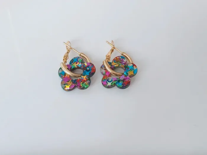 Boucles d’oreilles fleurs en résine – anneaux dorés