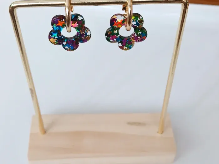Boucles d’oreilles fleurs en résine – anneaux dorés - photo numéro 1