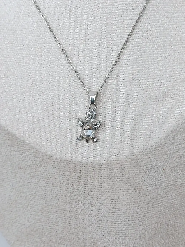 Collier pendentif tortue argenté avec strass brillants tendance chic été