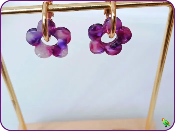Boucles d’oreilles fleurs en résine ton violet – anneaux dorés