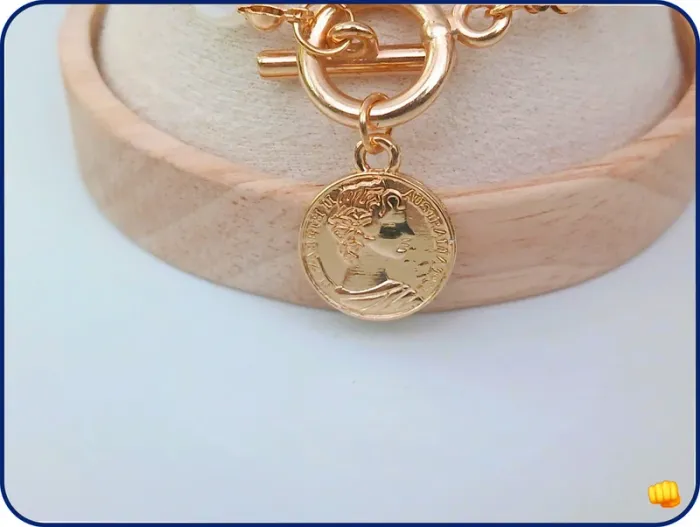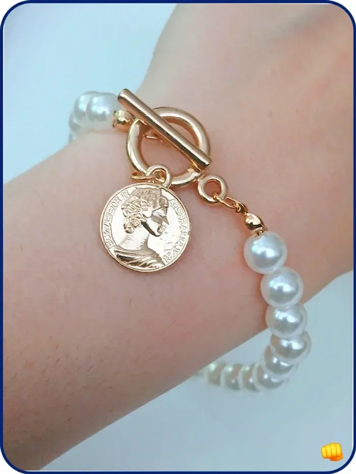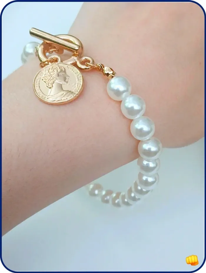 Bracelet perles blanches & breloque pièce – tendance et chic