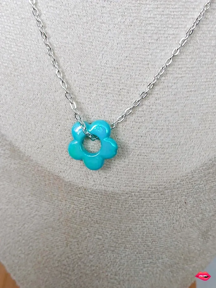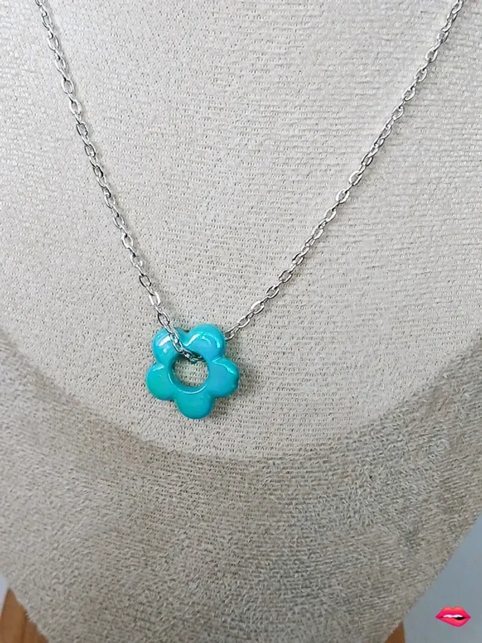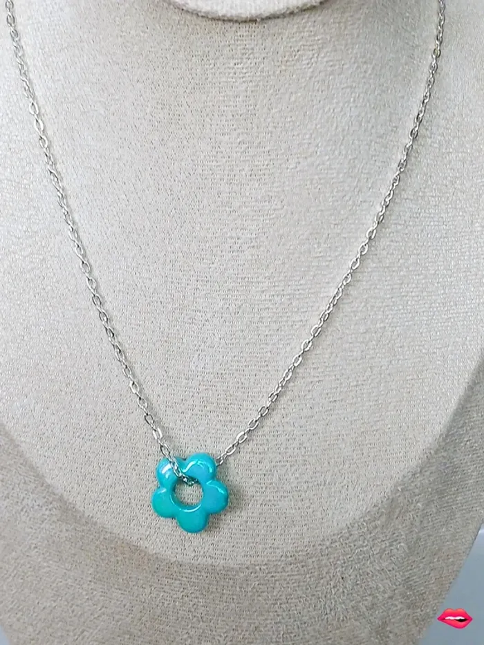 Collier chaîne argentée et pendentif fleur turquoise – look pop et lumineux - photo numéro 1