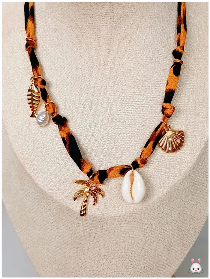 Collier foulard imprimé + breloques dorées et coquillage – Esprit bohème plage - photo numéro 1