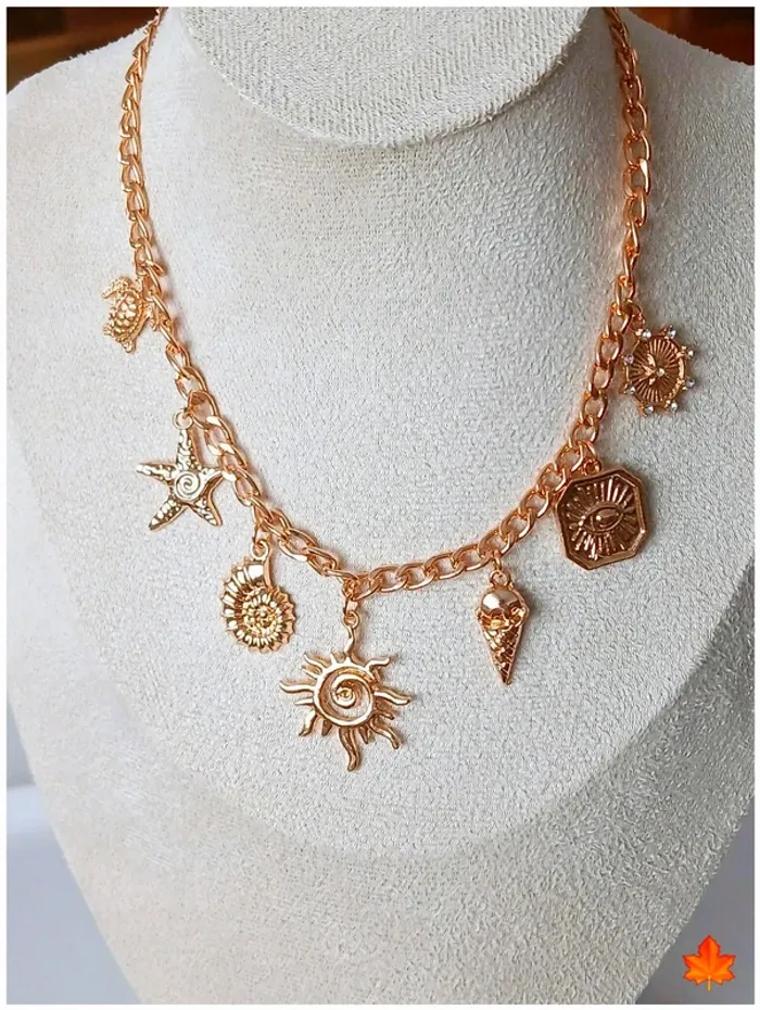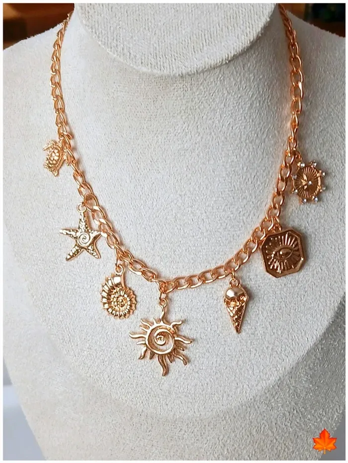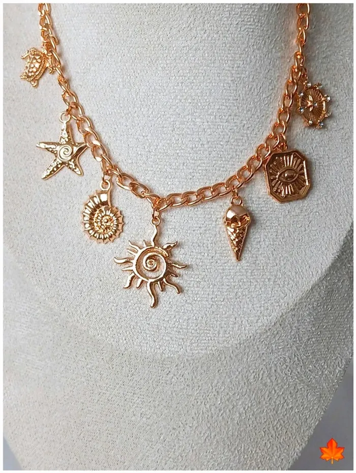 Collier doré breloques soleil, étoiles & coquillage – tendance bohème
