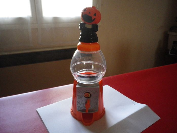 A la fois distributeur de bonbons et tirelire. Présente une petite fêlure sur le bas du globe plastique transparent. Hauteur 22 cm