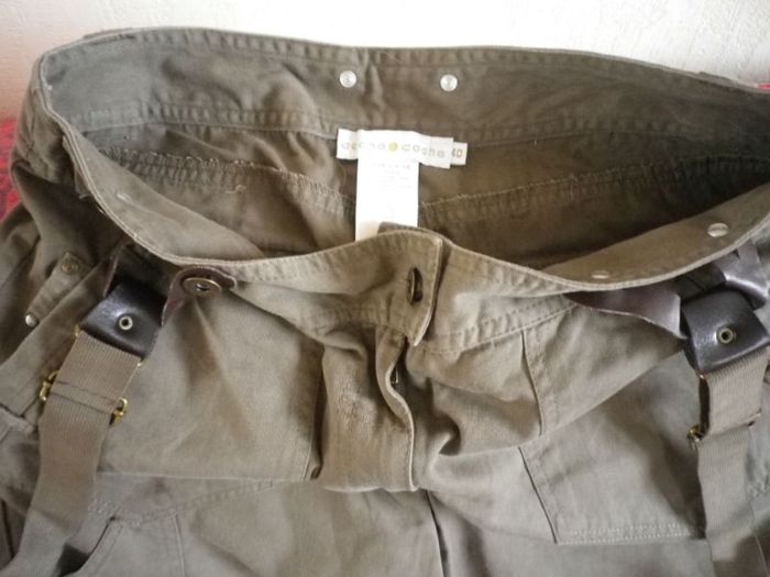 Bas des jambes qui peuvent se retrousser et transformer le pantalon en bermuda. Comporte des bretelles qui peuvent s'enlever ( élastiques des bretelles un peu moins élastiques)