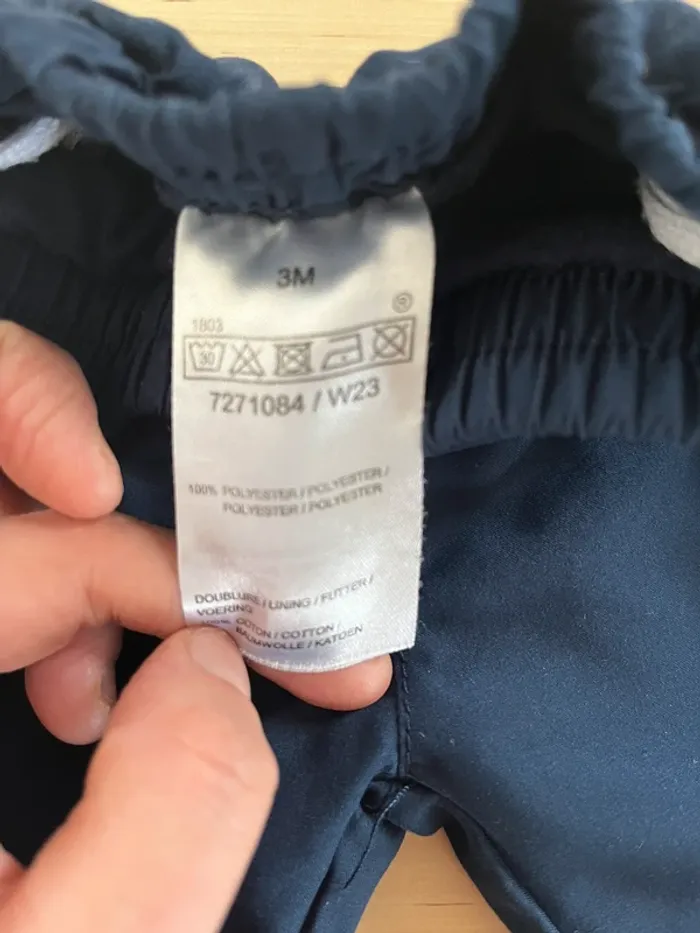 Pantalon bébé, trois mois doublure 100 % coton extérieur du vêtement 100 % polyester très bon état couleur bleu marine