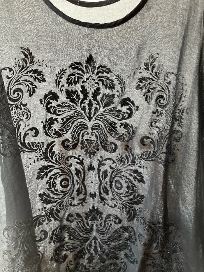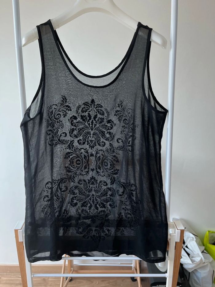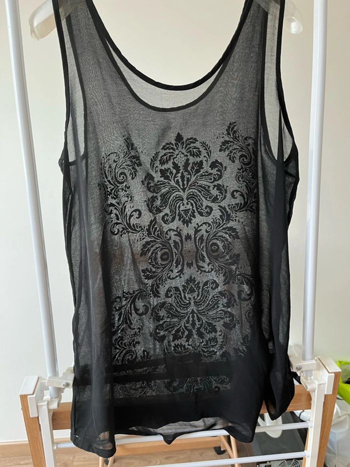 Haut femme couleur noir bon état Pas de marque pas de taille mais je mets habituellement du 38 40. Motifs qui ont tendance à s’effacer légèrement