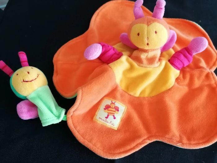 Doudou marionnette fleur orange louna l'abeille moulin roty
