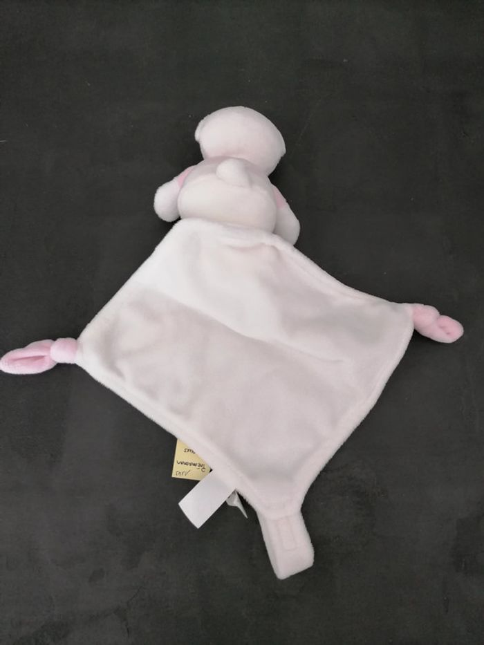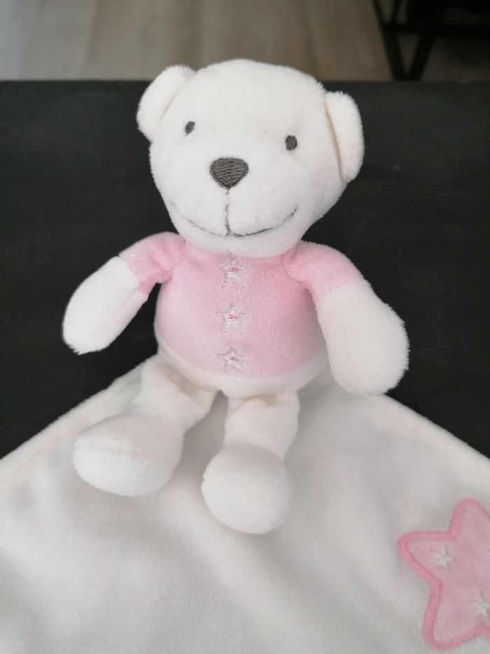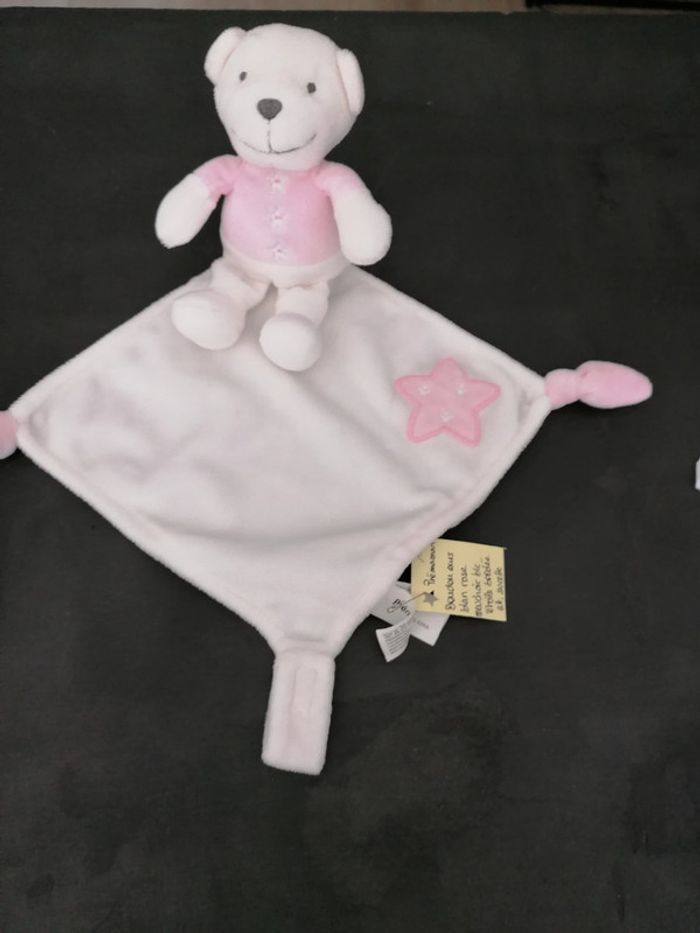 Doudou ours mouchoir premaman blanc rose Étoile rose, attache sucette