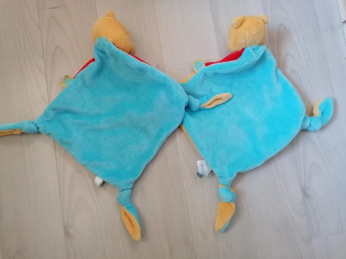 2 doudou Winnie l'ourson Disney baby rouge jaune et bleu fleur brodée