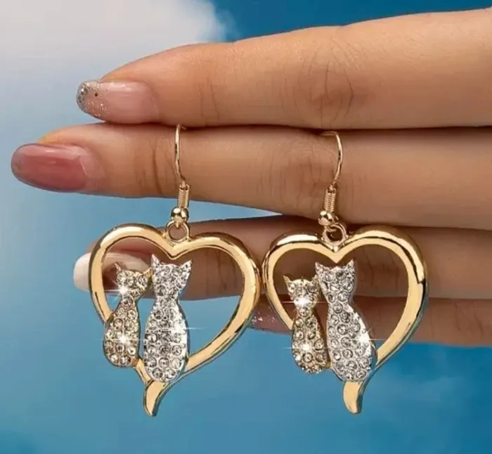 Boucles d oreilles pendantes avec chats en strass entourée de un grand cœur doré