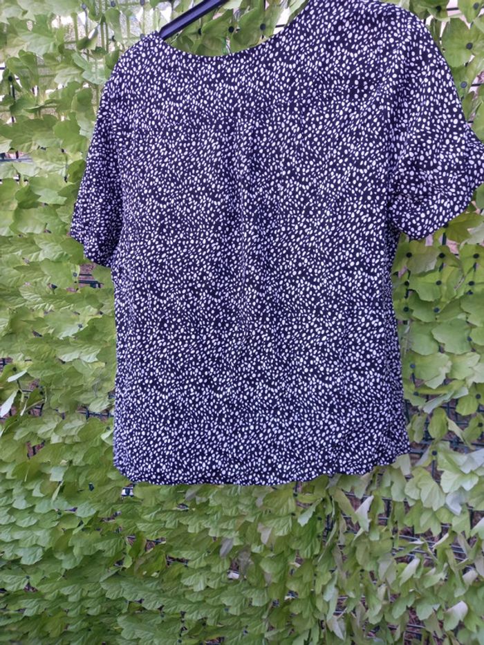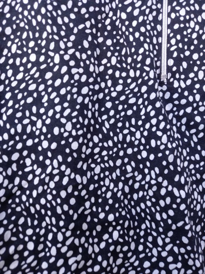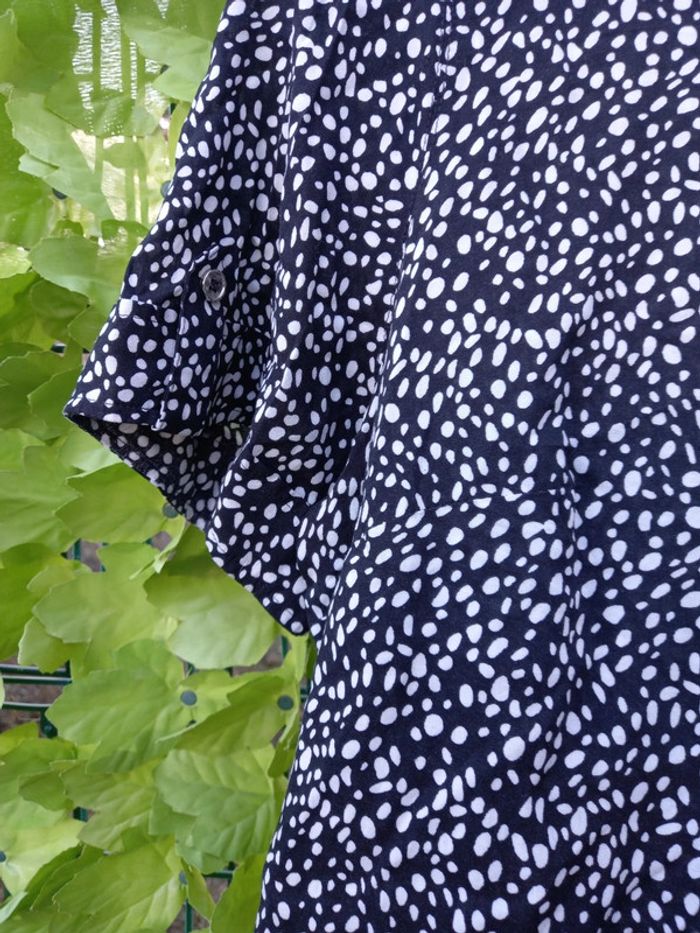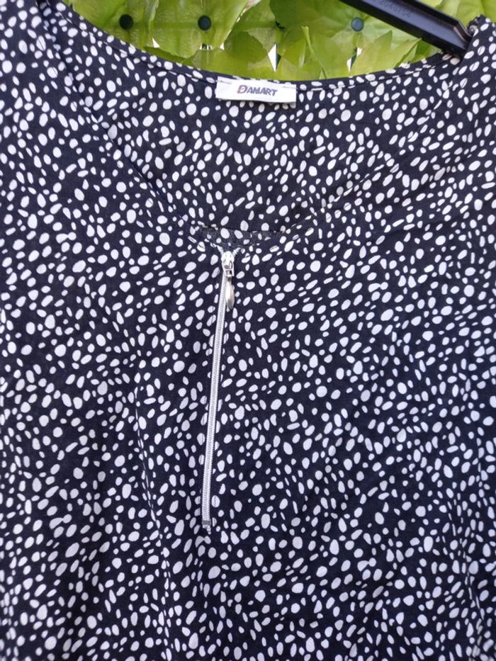 Chemisier femmes de couleurs noirs à petits pois blancs avec petites manches se ferme à l avant par un zip Longueur : 69,5 cm Longueur à partir des sous bras : 37,5 cm Longueur manche : 25,3 cm Largeur aisselle à aisselle 60 cm Marque : Damart Matiere : Viscose Marque : Damart Taille : 48