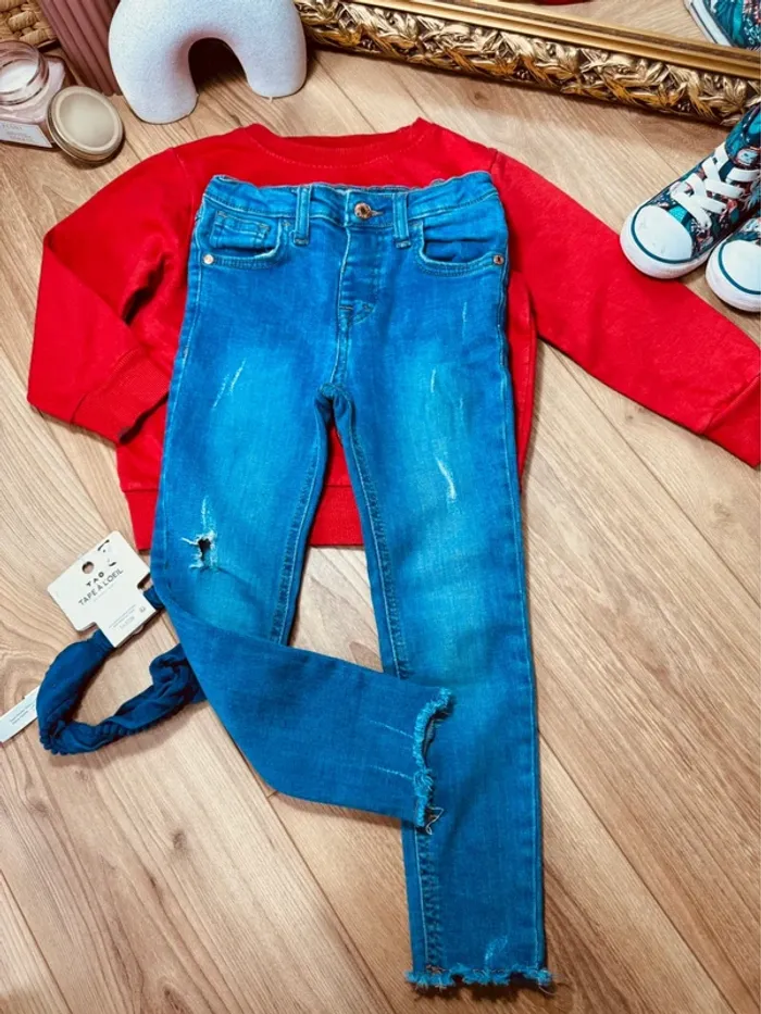 🩷 en excellent état, à noter une micro tache sur la manche (photo) * sweat-shirt * Jean taille réglable * bandeau tête NEUF Pour voir mes autres annonces ↩️ #fille5ansmorganleclerc ✅ Dressing trié par taille avec les # dans mon À PROPOS ⚠️ les chaussures ne sont pas à vendre !!!