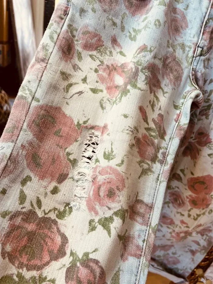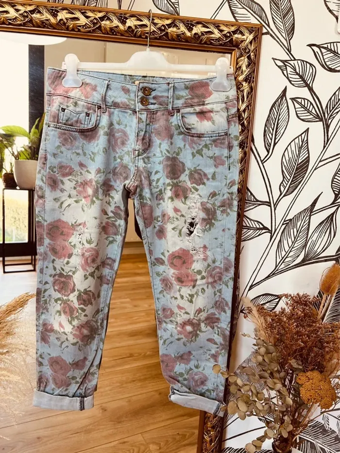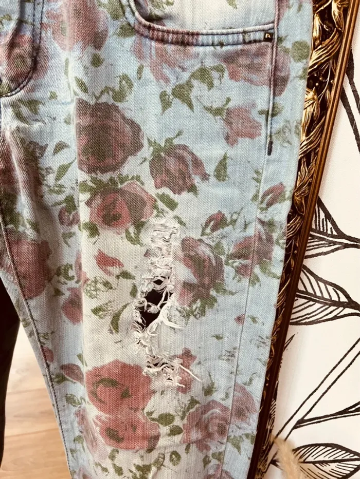 Taille L ~ 40 jean femme Bershka bleu à fleurs 🌺