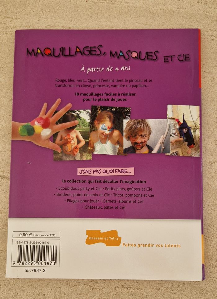 En très bon état, servi le temps d'un anniversaire. Résumé : Princesses, pirates, sorcières et sorciers... Laissez votre enfant se réinventer et exprimer sa créativité de façon ludique et festive ! Découvrez 18 modèles de maquillages faciles à réaliser par un enfant, seul ou avec l’aide d’un adulte, avec les doigts ou au pinceau. Pour chacun des modèles, retrouvez les explications pas à pas simples et claires, expliquées par de nombreuses photos et des pictogrammes qui permettront à votre enfant d’identifier chaque tâche à réaliser. En plus, vous trouverez des conseils pour découvrir les différents types de maquillages, utiliser les bons pinceaux et mélanger les couleurs. Un bon moment à partager entre petits et grands !