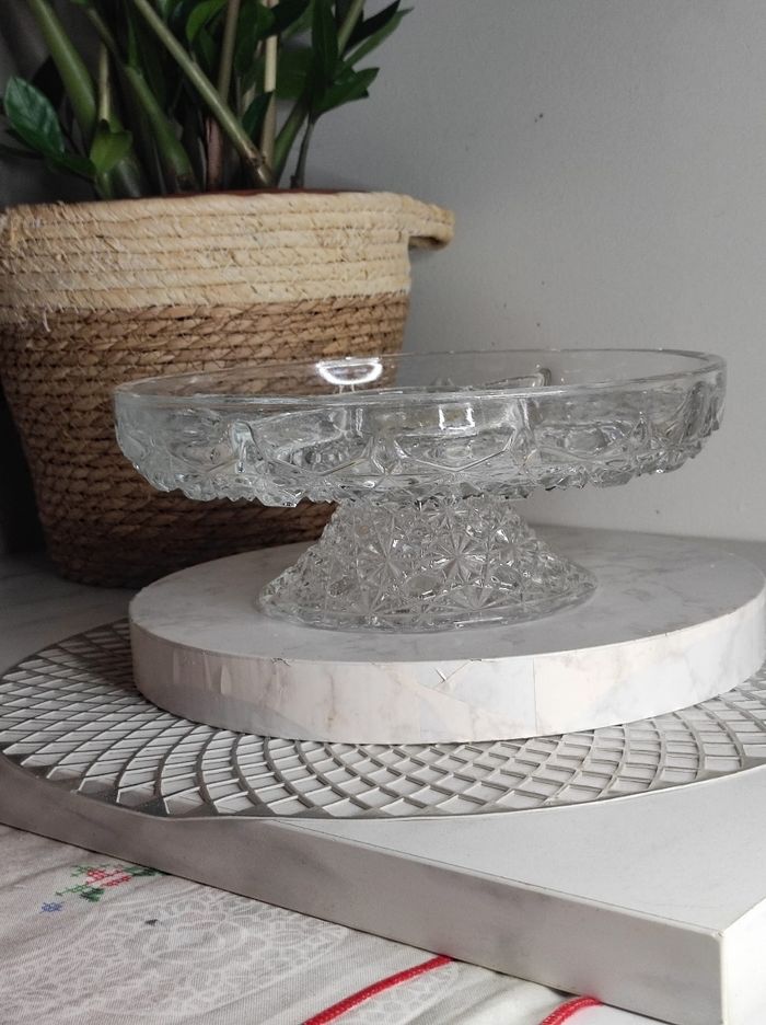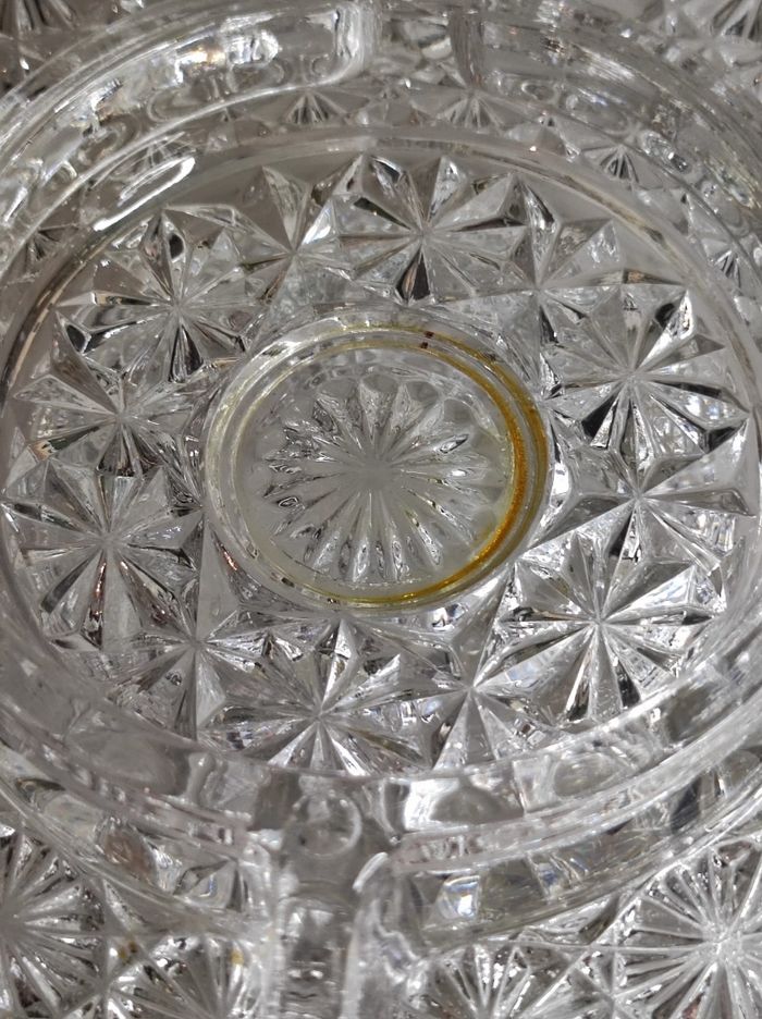 Ancien plat de service pour apéritif en verre ciselé sur pied. Aucune fêlure ou ebruchures en parfait état. Seulement je n'ai pas réussi à accéder à un coin pour nettoyer ( je n'ai pas ce qu'il faut ) cf photo. Dimensions H 9,5 x D 25 cm.