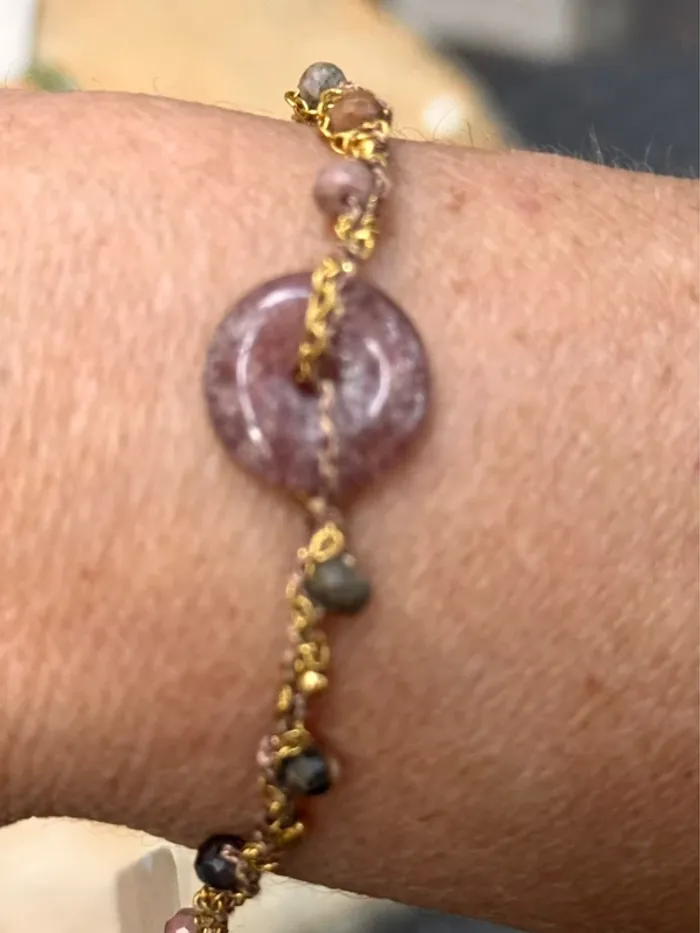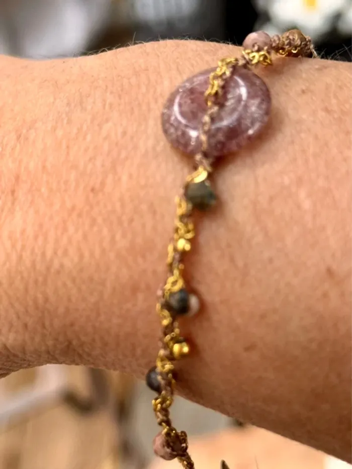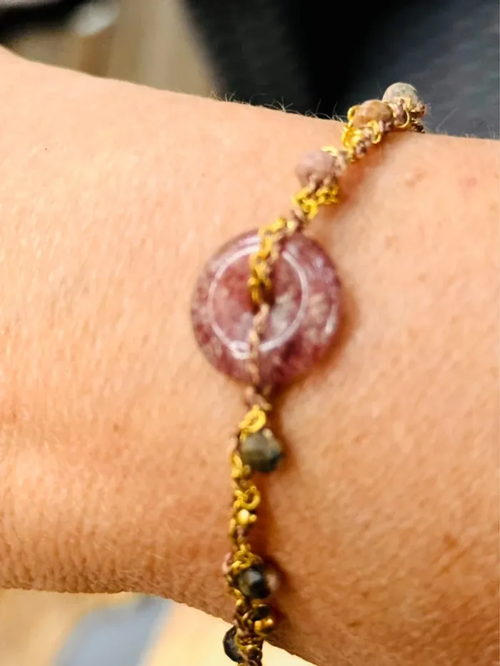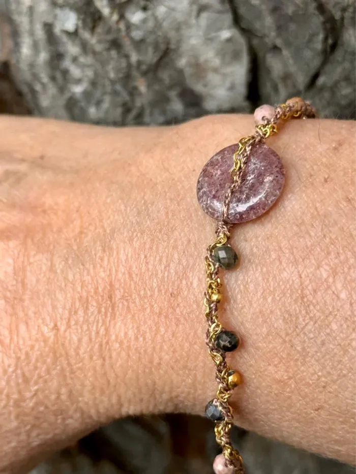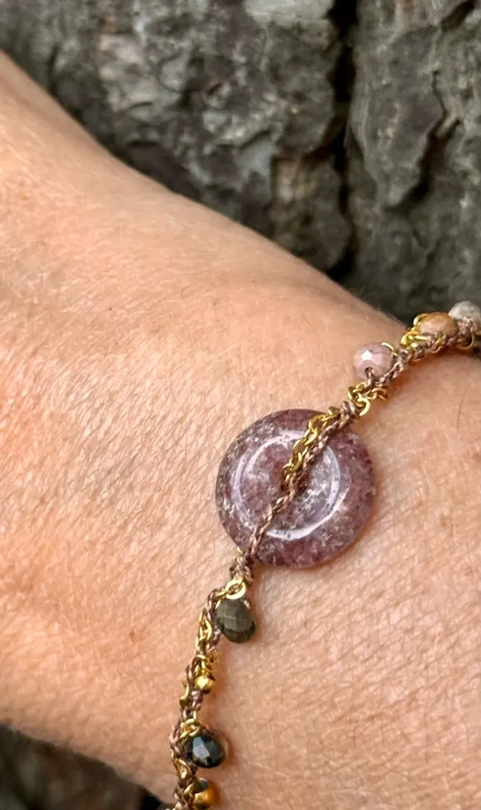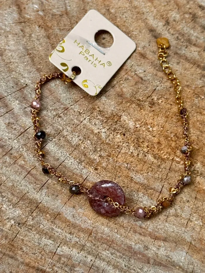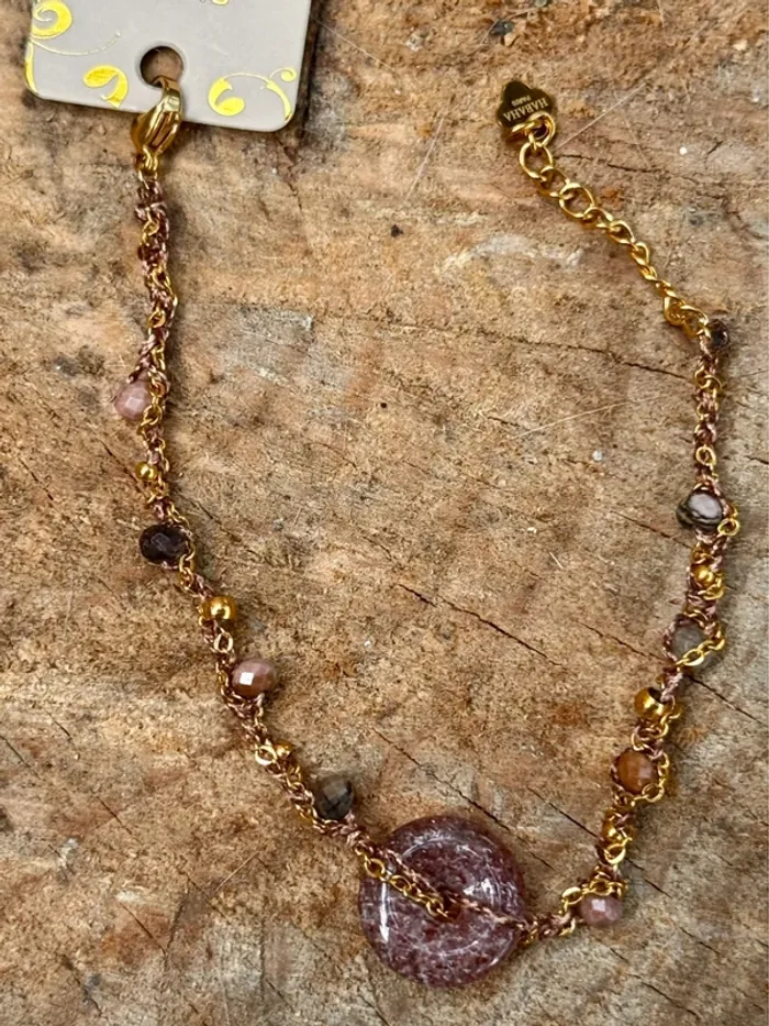 Bracelet réglable xhaine acier inoxydable or et cordons tissés entrelaces avec perles en breloque et pierre au centre naturelles Fluorine améthyste et jade Marque HABAHA Paris neuf dans pochons