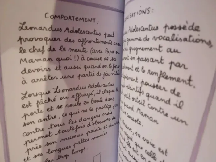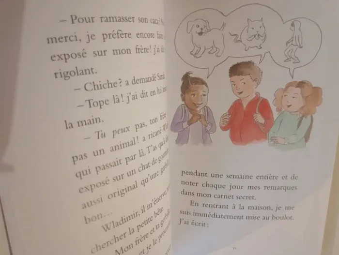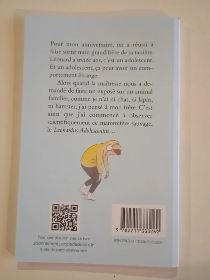 Pour mon anniversaire, on a réussi à faire sortir mon grand frère de sa chambre. Léonard a treize ans, c'est un adolescent. Et un adolescent, ça peut être très bizarre, souvent. Alors quand la maîtresse nous a demandé de faire un exposé sur un animal familier, comme je n'ai ni chat, ni lapin, ni hamster, j'ai pensé à mon frère. C'est ainsi que j'ai commencé à observer scientifiquement ce mammifère sauvage, le Leonardus adolescentus... Éditeur ‏ : ‎ Ecole des Loisirs 72 pages Âge de lecture ‏ : ‎ 6 - 9 ans Dimensions ‏ : ‎ 12.5 x 0.7 x 18.9 cm Livre en très bon état Je vends d'autres romans de l'Ecole des Loisirs #phil_peg_écoledesloisirs #écoledesloisirs #adolescent #maitresse #animal