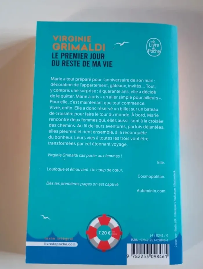 Marie a tout préparé pour l’anniversaire de son mari : décoration de l’appartement, gâteaux, invités… Tout, y compris une surprise : à quarante ans, elle a décidé de le quitter. Marie a pris « un aller simple pour ailleurs ». Pour elle, c’est maintenant que tout commence. Vivre, enfin. Elle a donc réservé un billet sur un bateau de croisière pour faire le tour du monde. À bord, Marie rencontre deux femmes qui, elles aussi, sont à la croisée des chemins. Au fil de leurs aventures, parfois loufoques, elles pleurent et rient ensemble, à la reconquête du bonheur. Leurs vies à toutes les trois vont être transformées par ce voyage au bout du monde. Éditeur ‏ : ‎ Livre de Poche 336 pages Dimensions ‏ : ‎ 11 x 18 cm Livre en très bon état Je vends d'autres livres de Virginie Grimaldi #phil_peg_grimaldi et #phil_peg_feelgood #grimaldi