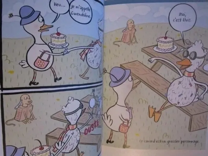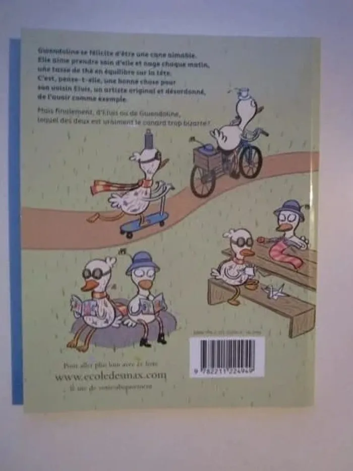 Gwendoline est une cane vraiment très soignée : elle fait chaque matin ses exercices de gymnastique, nage toujours avec une tasse de thé en équilibre sur la tête et regarde chaque soir les étoiles avant d’aller se coucher. Alors quand Elvis, un canard artiste mal peigné, farfelu et vraiment pas très bien élevé, s’installe dans la maison voisine, elle est loin d’être ravie. Elle l’accueille cependant avec gentillesse et, surprise, se découvre plein de passions communes avec ce drôle de voisin. Ils deviennent rapidement les meilleurs amis. Tout va pour le mieux jusqu’au jour où ils entendent d’autres canards dire de l’un d’eux : «...vraiment trop bizarre, ce canard » Editeur : Rue de Sèvres 104 pages Dimensions : 22 x 17 cm Âge : 5 -8 ans Livre en très bon état Je vends d'autres livres de l'école des loisirs #phil_peg_ruedesevres #phil_peg_écoledesloisirs #canard #artiste #voisin