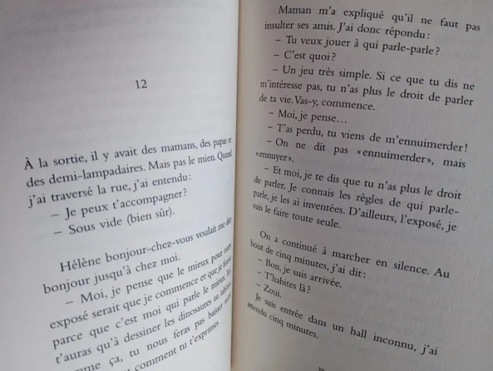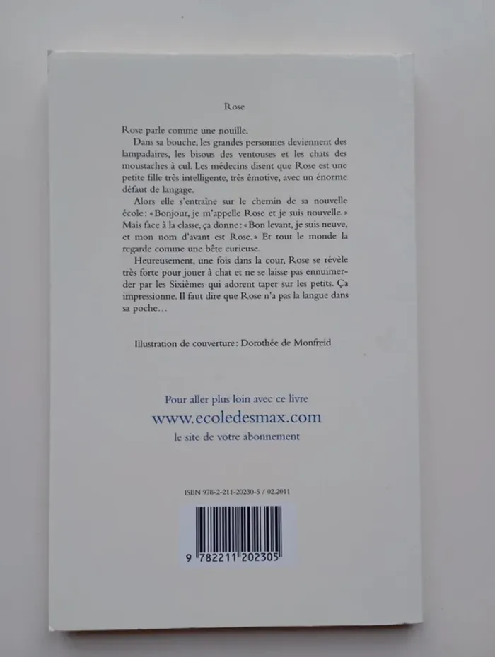 Rose parle comme une nouille. Dans sa bouche, les grandes personnes deviennent des lampadaires, les bisous des ventouses et les chats des moustaches à cul. Les médecins disent que Rose est une petite fille très intelligente, très émotive, avec un énorme défaut de langage. Alors elle s’entraîne sur le chemin de sa nouvelle école : « Bonjour, je m’appelle Rose et je suis nouvelle. » Mais face à la classe, ça donne : « Bon levant, je suis neuve, et mon nom d’avant est Rose. » Et tout le monde la regarde comme une bête curieuse. Heureusement, une fois dans la cour, Rose se révèle très forte pour jouer à chat et ne se laisse pas ennuimerder par les Sixièmes qui adorent taper sur les petits. Ça impressionne. Il faut dire que Rose n’a pas la langue dans sa poche… Éditeur : École des Loisirs Dimensions : 12,5 x 19 cm Age : 6 - 8 ans 88 pages Livre en excellent état Je vends d'autres livres de l'école des loisirs #phil_peg_écoledesloisirs #écoledesloisirs #romanjeunesse #affirmation de soi #communication #école, instituteur #imagination, fabulation