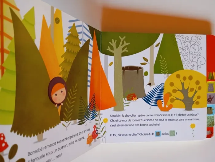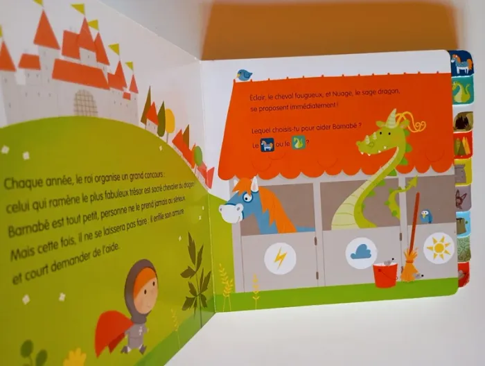 Pour être sacré chevalier du dragon, Barnabé doit ramener au roi le plus fabuleux des trésors. Mais comment faire ? Trop de possibilités s'offrent à lui : il a besoin de toi ! Au cours de l'histoire, tes choix le mèneront vers des aventures toutes très différentes. Deviens le héros et à chaque page, choisis un onglet pour continuer l'histoire. Découvre 8 histoires différentes à faire et à refaire, en un seul livre ! Éditeur ‏ : ‎ AUZOU 16 pages Âge de lecture ‏ : ‎ 1 - 3 ans Dimensions ‏ : ‎ 18 x 2.5 x 18 cm Livre en très bon état #chevalier #dragon