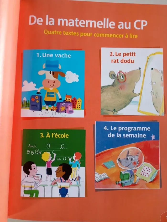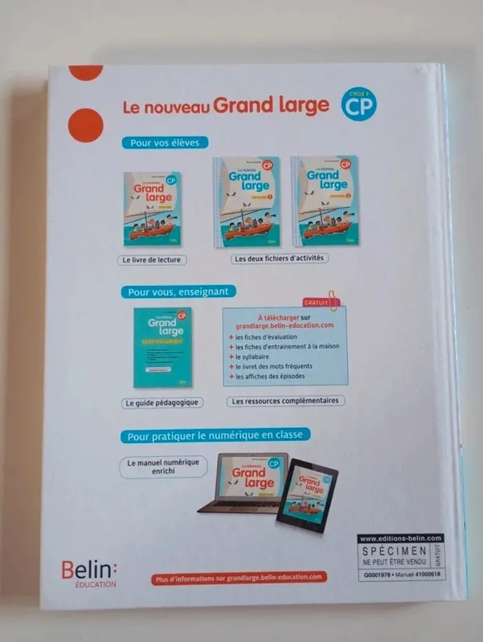 Le nouveau Grand large est une méthode intégrative d'apprentissage de la lecture au CP. La programmation des activités vise à développer simultanément l'identification des mots, l'accès au sens, ainsi que la capacité à produire de l'écrit. Une nouvelle progression s'appuyant sur le résultat des dernières recherches, notamment sur le rapport Lire et Écrire, dirigé par Roland Goigoux en 2015 ainsi que sur les recommandations de la Conférence de consensus organisée par le CNESCO et l'IFE en 2016. De nouveaux textes de littérature jeunesse et l'introduction de nouveaux genres comme la recette ou la bande dessinée. L'expérience des enseignants qui ont choisi et utilisé la méthode originale en classe depuis 10 ans. Pour vos élèves Le livre de lecture : 5 histoires complètes ponctuées par des documentaires, une bande dessinée et une recette. En téléchargement : Le syllabaire : un outil pour systématiser la lecture de syllabes et structurer l'identification des correspondances grapho-phonétiques, et qui servira en remédiation pour s'entrainer individuellement. Le livret des mots fréquents : construit à partir de la liste officielle des mots les plus fréquents de la langue française, pour travailler la reconnaissance et l'orthographe de 40 à 60% des mots d'un texte. Éditeur ‏ : ‎ BELIN EDUCATION 120 pages Âge de lecture ‏ : ‎ Dès 6 ans Dimensions ‏ : ‎ 19.6 x 1 x 25.7 cm Livre en excellent état (specimen) Je vends d'autres livres scolaires #phil_peg_livrescolaire #cp #livrescolaire #apprentissagelecture