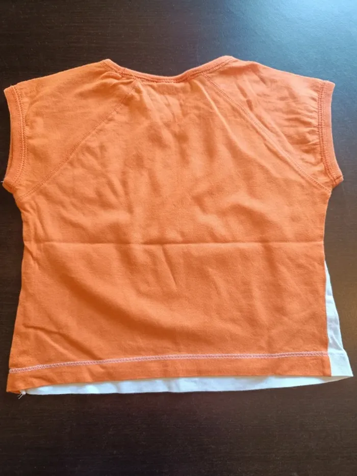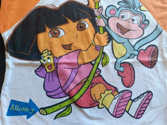 Tee shirt DORA L'EXPLORATRICE Blanc avec impressions colorées sur le devant Manches courtes oranges Dos uni orange 100% Coton TAILLE 3 ANS TRES BON ETAT Allez voir mes autres ventes!