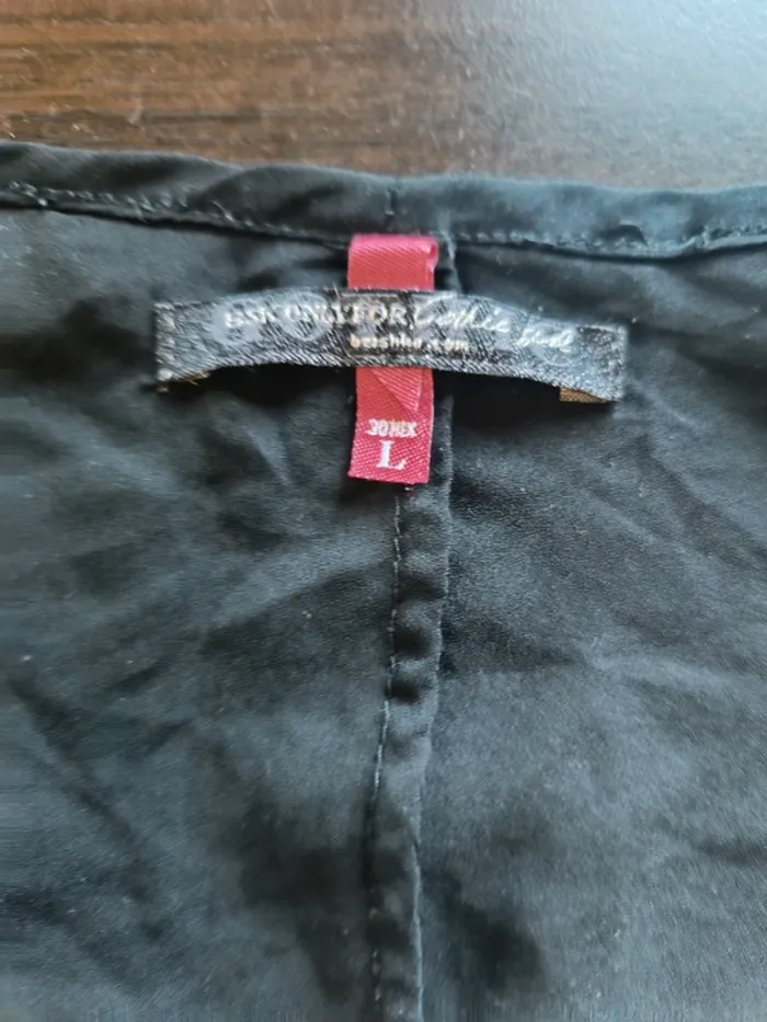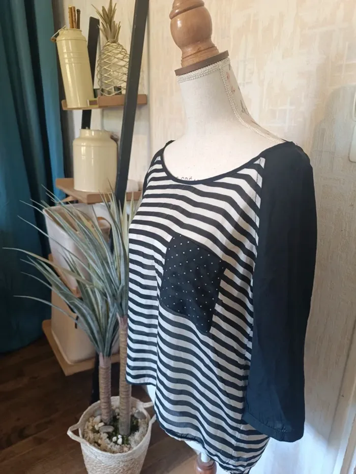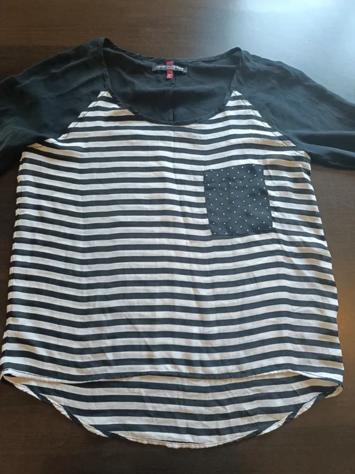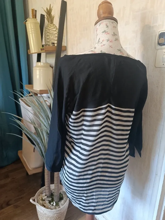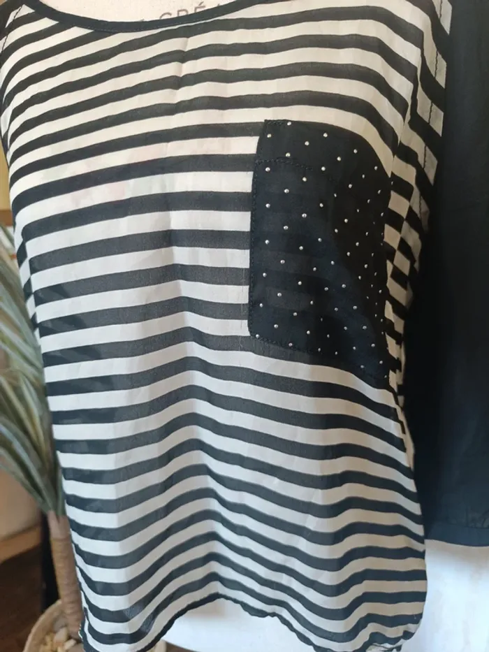 Blouse BERSHKA Noire rayures blanches Manches 3/4 noires 1 poche poitrine avec petits points métal Matière légère & fluide TAILLE L TRES BON ETAT Allez voir mes autres ventes!