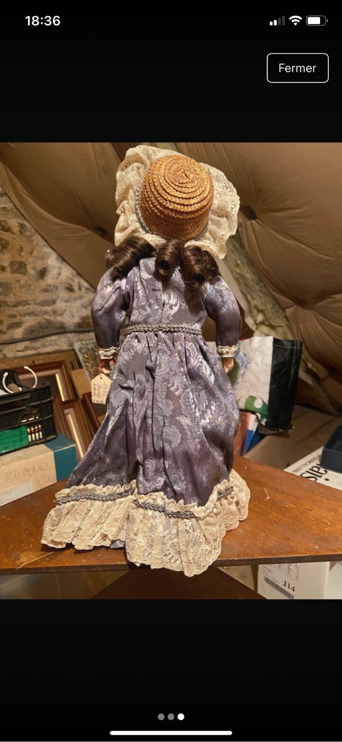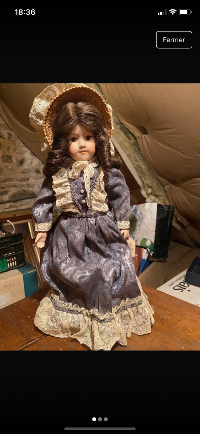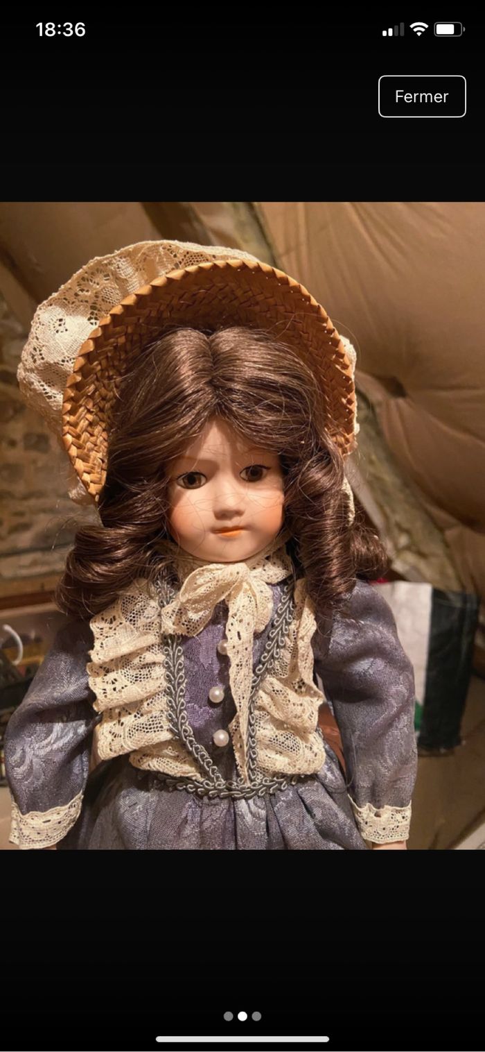 A vendre. Magnifique poupée en porcelaine avec des cheveux naturels. Elle est vendue avec son socle en bois. Ses vêtements sont de qualité. Taille : 42 cm(debout).