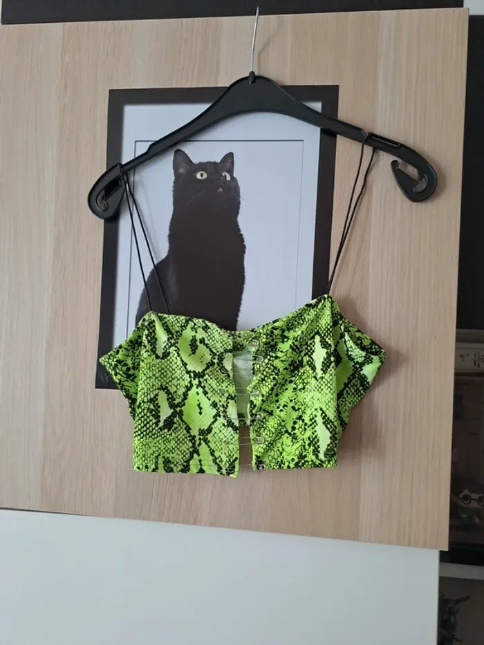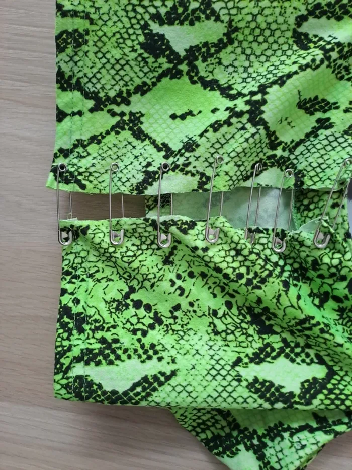 Petit haut bretelles élastiques Très court genre bralette Look punk rock Vert imprimé serpent avec épingles à nourrice pour fermer devant Taille unique
