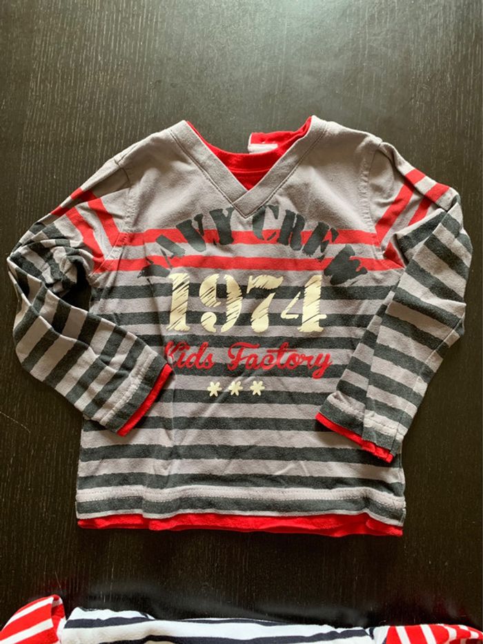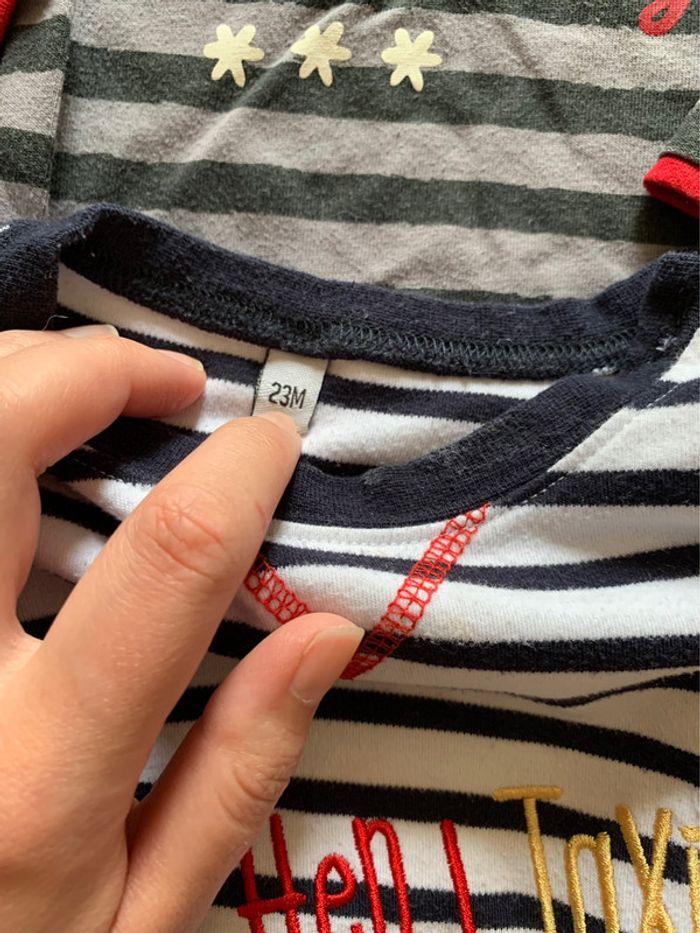 lot de 2 pulls légers à rayures légère tâche sur le col du pull avec la voiture usure liée aux lavages 2 ans #bebevelivelo #2ansvelivelo