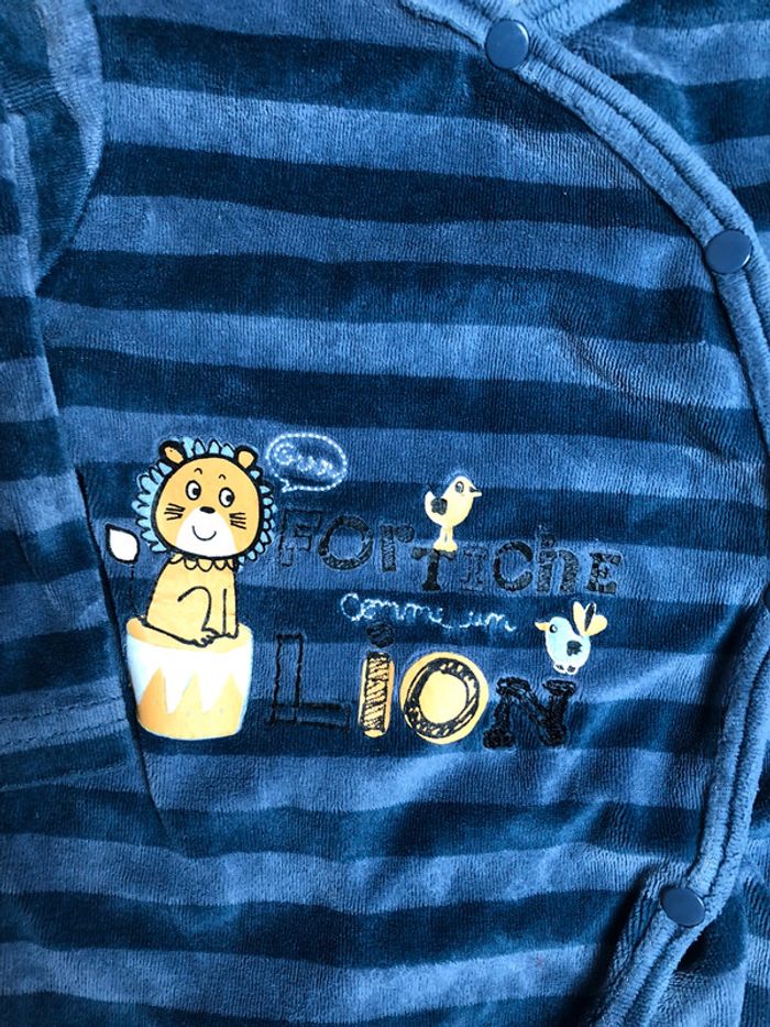 pyjama rayé marine et bleu avec un lion jaune orangé 18 mois tissaia #bebevelivelo #18moisvelivelo #tissaiavelivelo