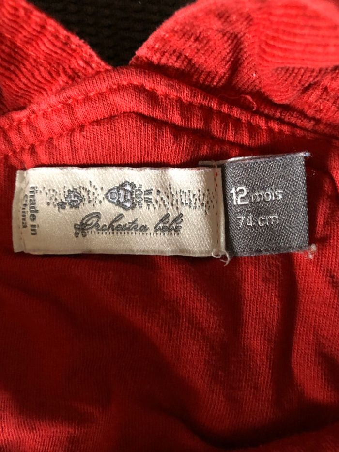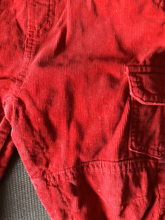 salopette en velours rouge quelques légères tâches devant orchestra 12 mois #bebevelivelo #orchestravelivelo #12moisvelivelo