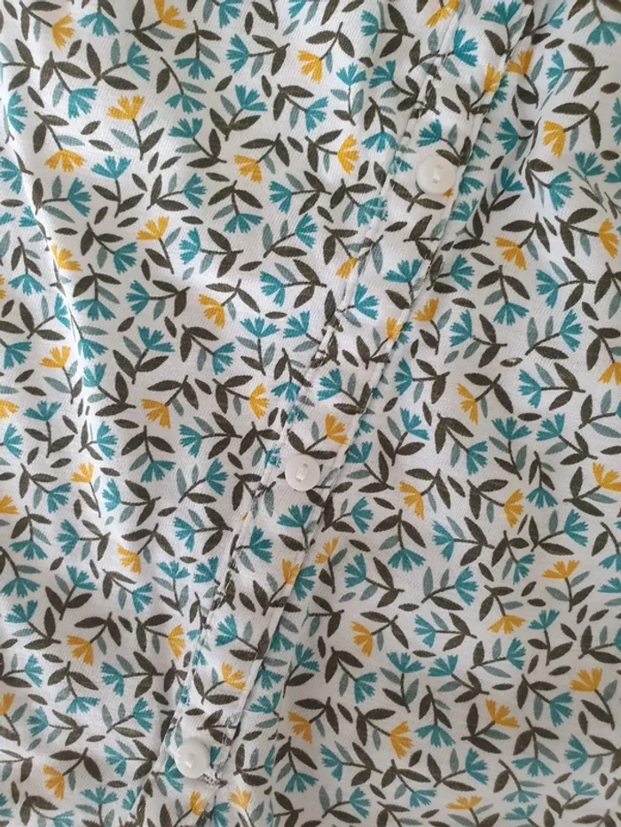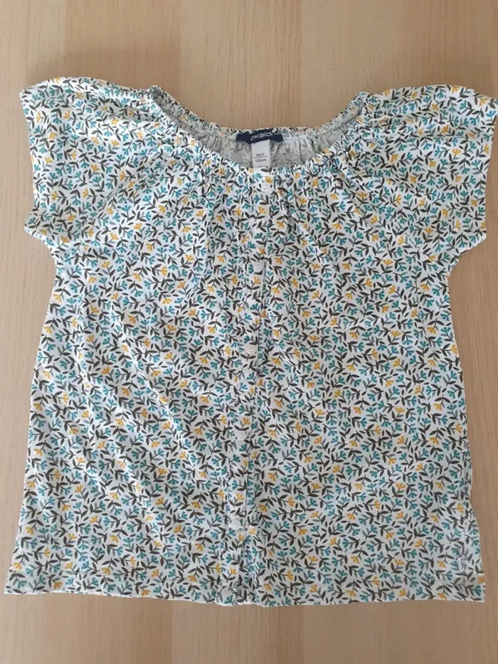 Tee-shirt Okaïdi Taille 8 ans Motif fleuri bleu vert/jaune moutarde Boutons sur le devant mais juste décoratifs Col élastiqué Très bon état #sansynonavêtementsfille8ans