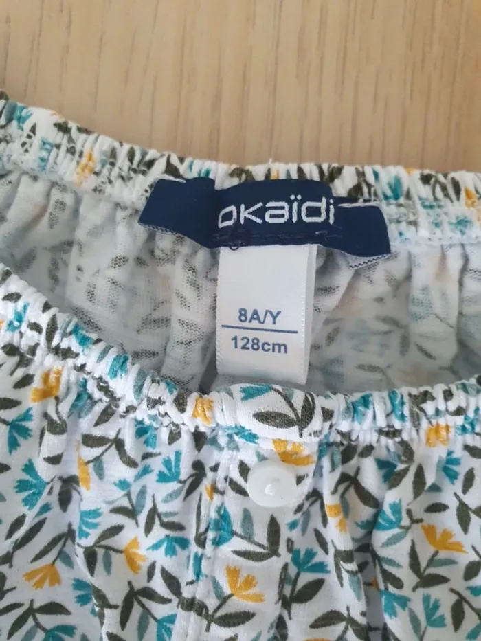 Tee-shirt Okaïdi Taille 8 ans Motif fleuri bleu vert/jaune moutarde Boutons sur le devant mais juste décoratifs Col élastiqué Très bon état #sansynonavêtementsfille8ans