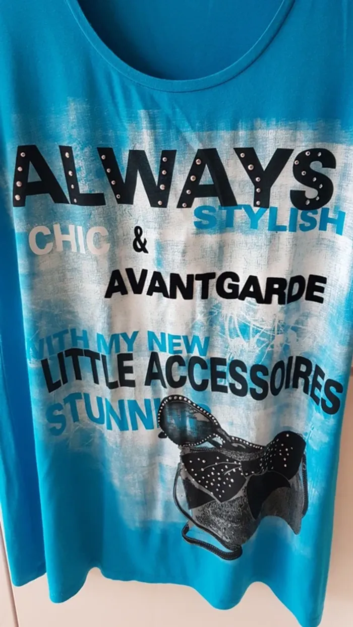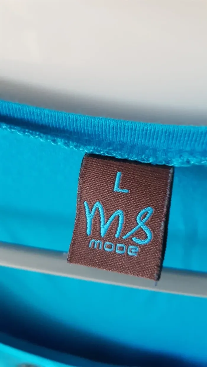 Très joli tee-shirt long Ms Mode Bleu turquoise avec motifs Taille L Matière souple et fluide Viscose/elasthanne Porté quelques fois, en très bon état #sansynonavêtementsfemme