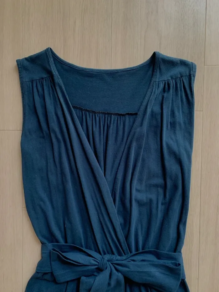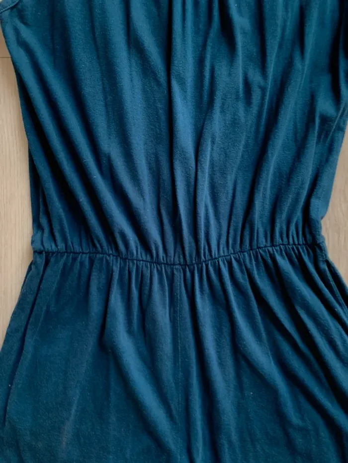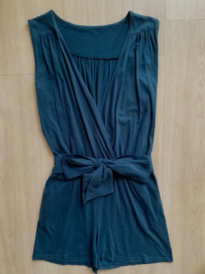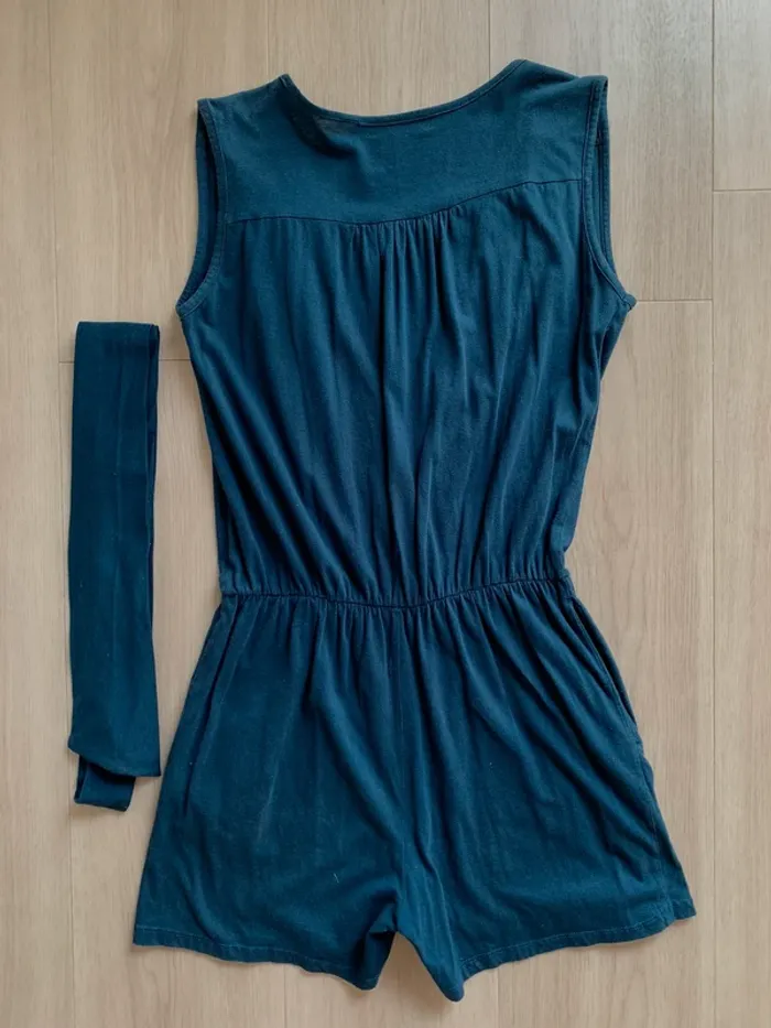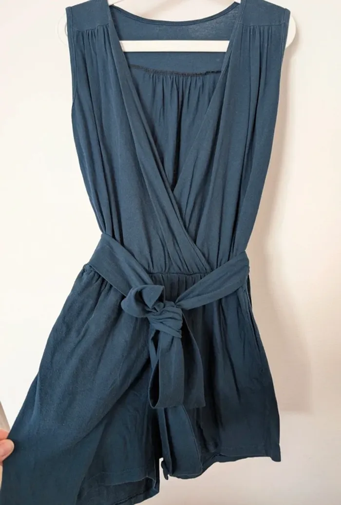 Combinaison short en coton bleu gris. Deux poches latérales & possibilité de ceinturer. Très bon état.