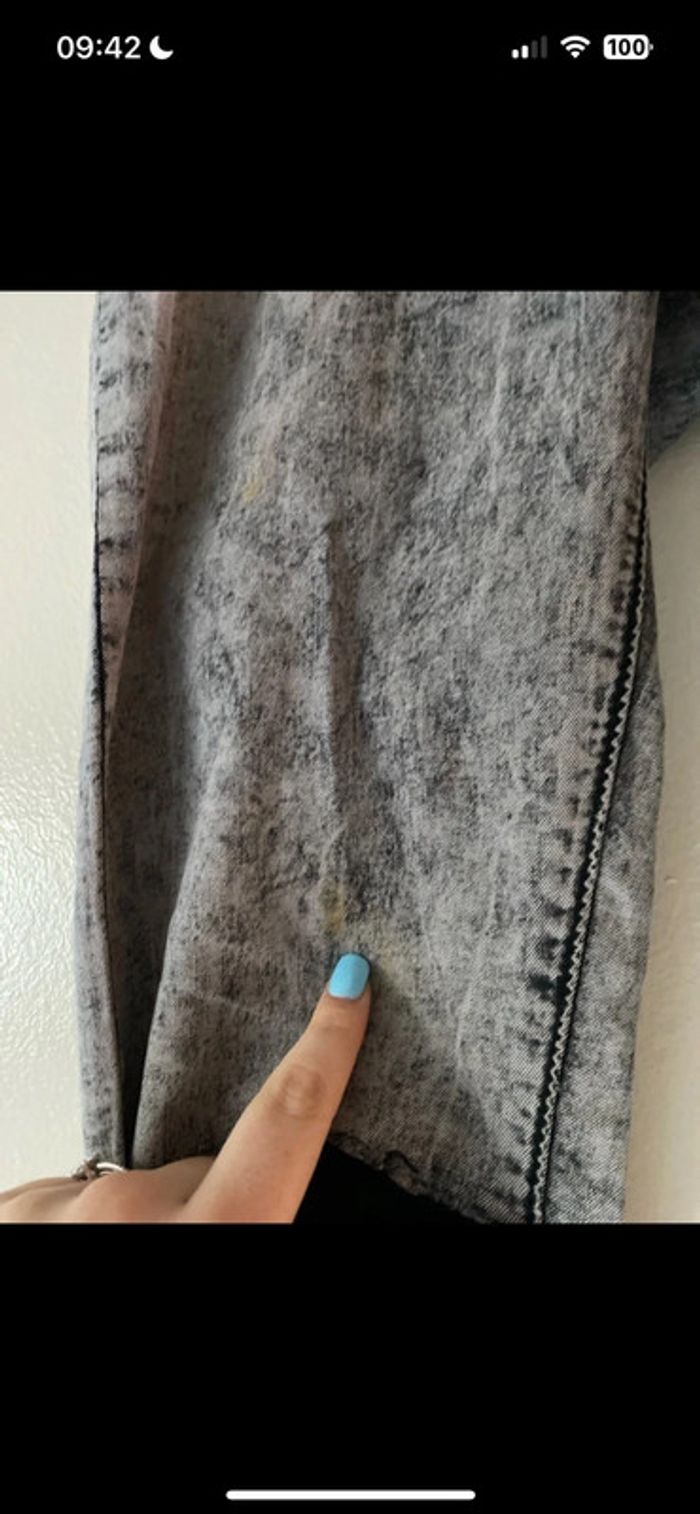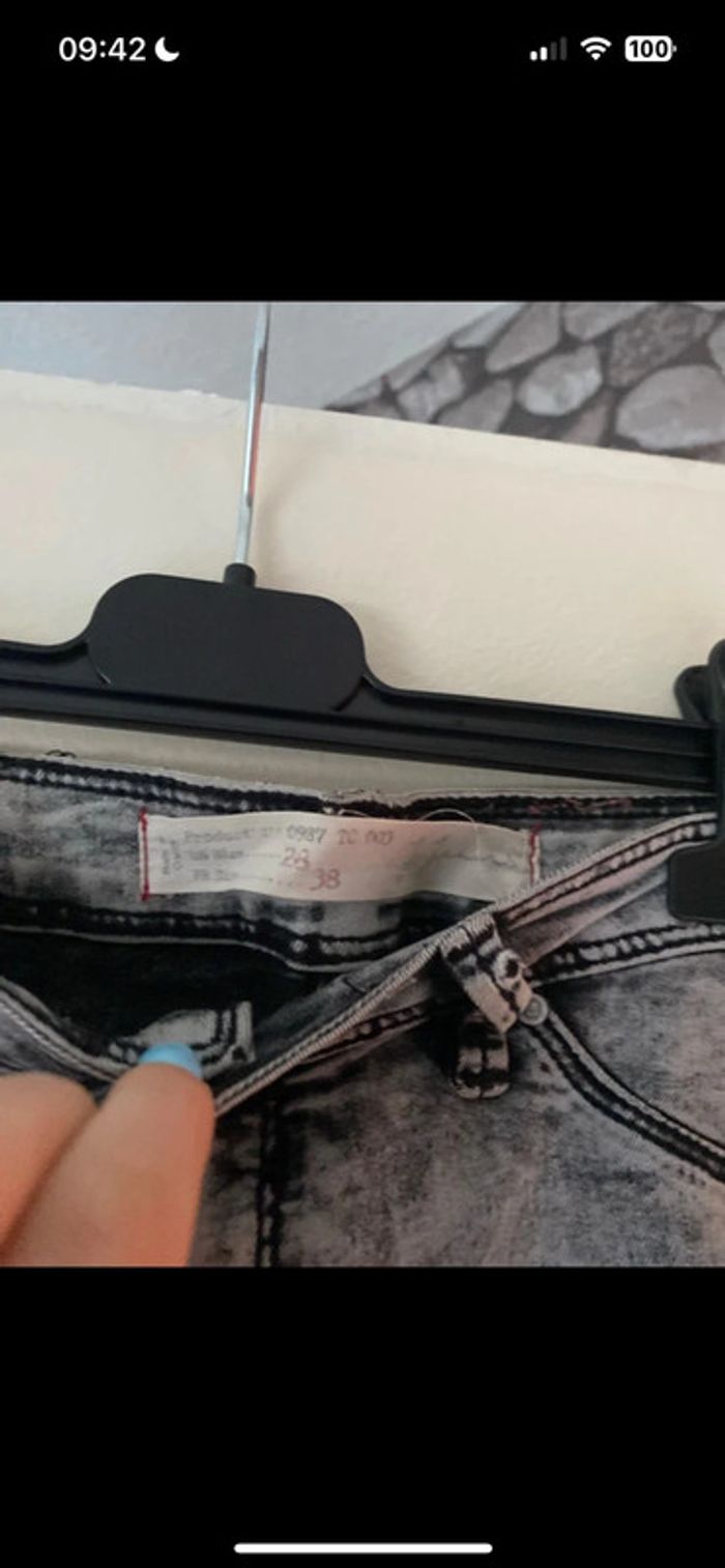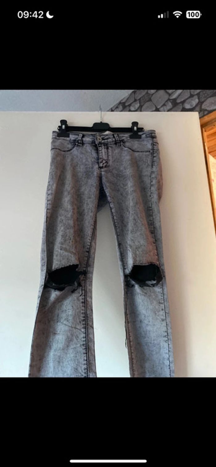 Jean troué en taille 38. Il a deux petites taches, voire trois qui partent au lavage à part ses tâches. Il reste en très bon état. Zara #clo_hprd_femme38