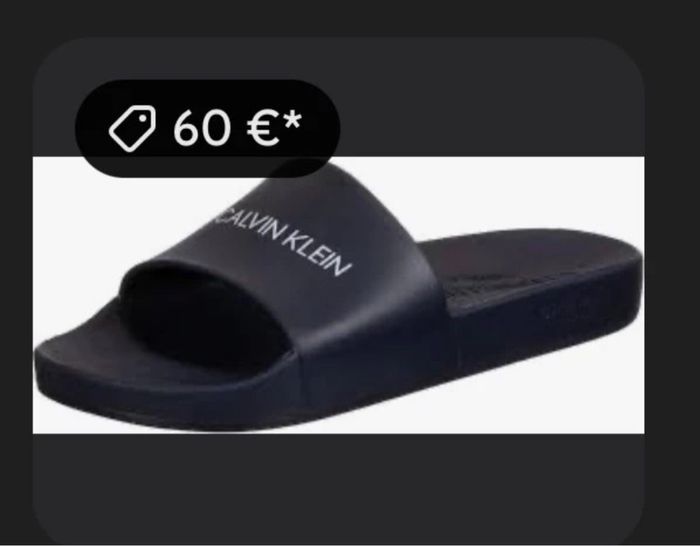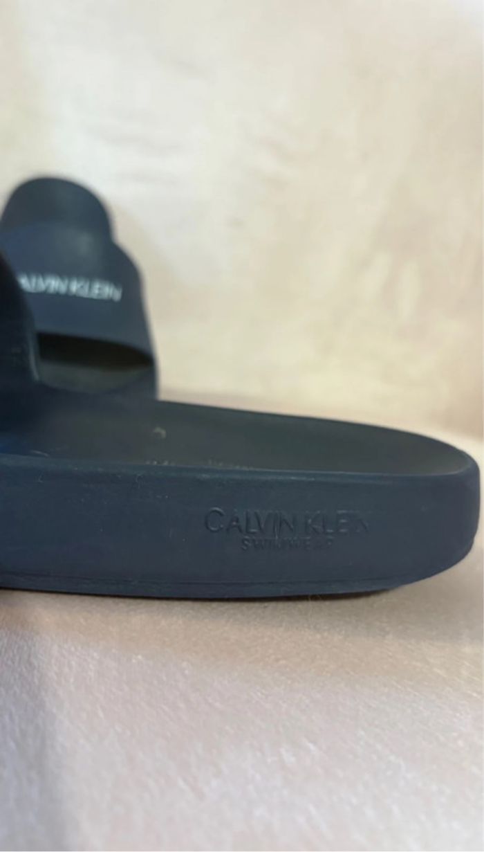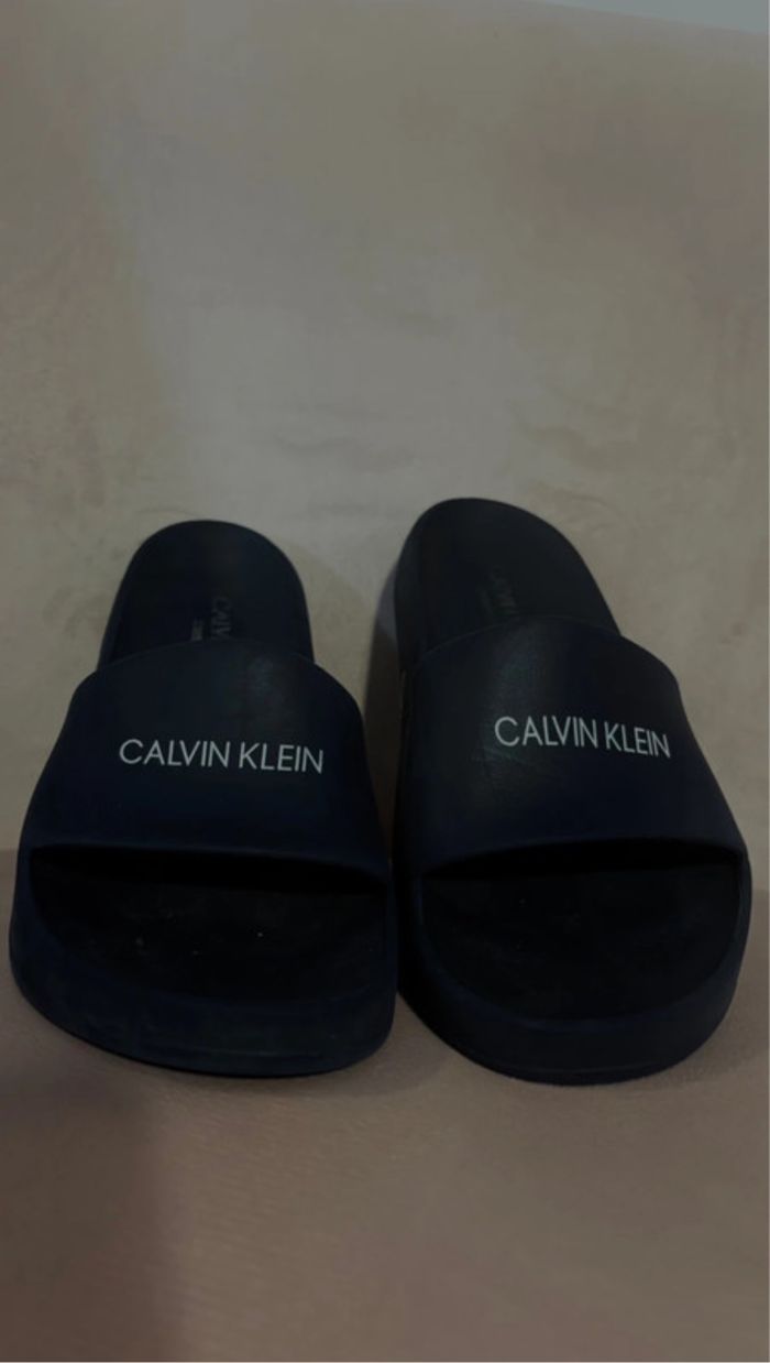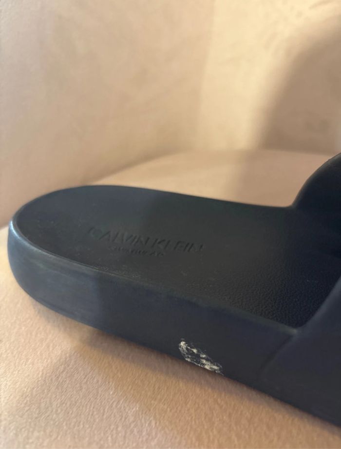 Claquettes Calvin Klein originales, confortables et stylées. Portées quelques fois mais encore en très bon état. Un petit accroc sur le côté (visible sur la photo 3), mais rien qui gêne à l’usage. N’hésitez pas à faire des offres