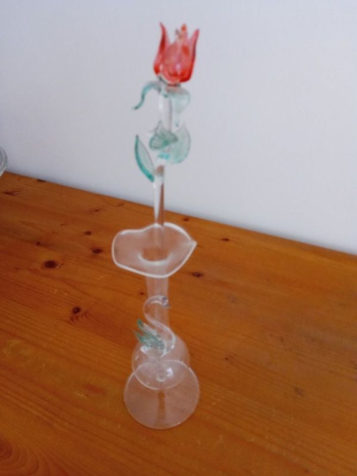 Soliflore et sa rose rouge en verre. Hauteur 26cm environ. En très très bon état.