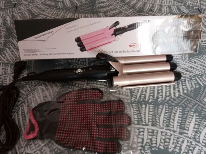 Fer à friser boucleur 3 têtes en céramique de tourmaline qui n'abîme pas les cheveux, diamètre 25 mm avec gant anti-brûlure. Deux réglages de chauffage 180°C et 210°C. Idéal pour cheveux fins ou épais de longueur moyenne à longue. Neuf, jamais utilisé, de couleur or. Marque KENLUMO