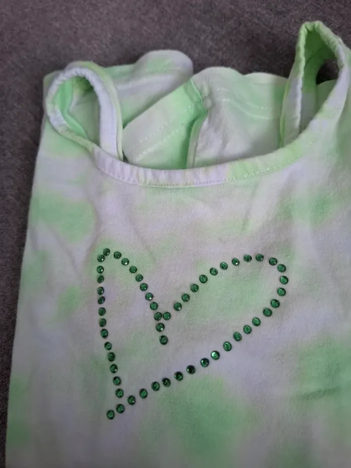Débardeur blanc et vert en TBE motif coeur en strass en 100% coton. Taille 7/8 ans (122/128) marque Zeeman #8anssevy57