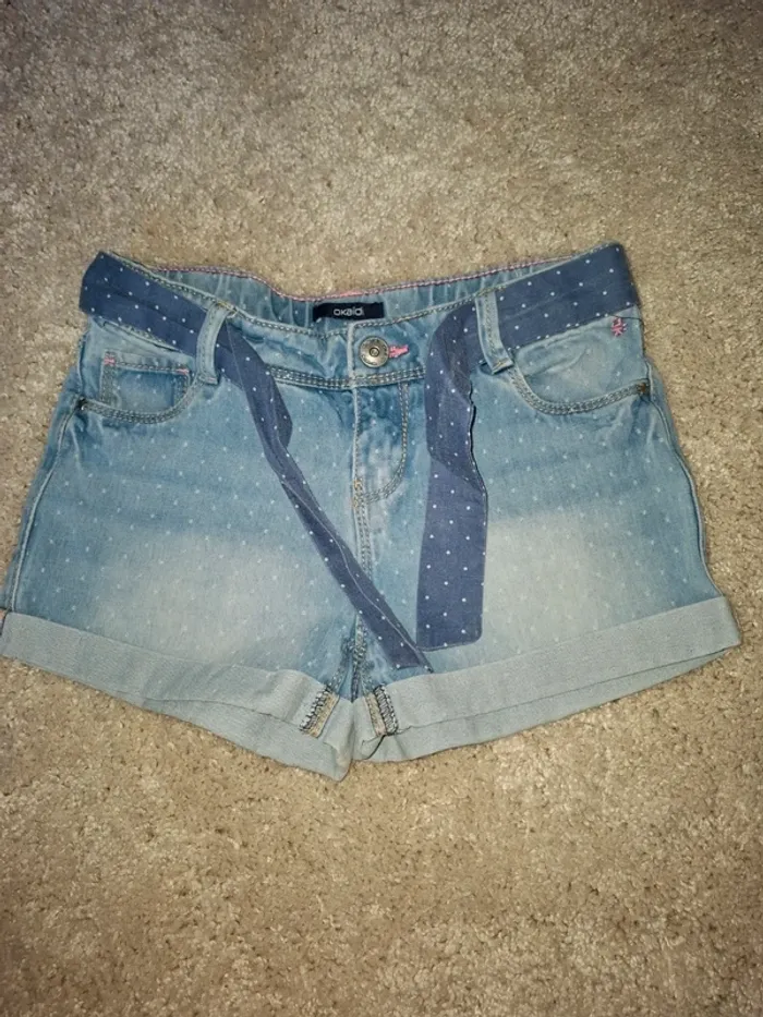 Short en jean bleu clair broderies petits points en TBE. Taille réglable Taille 7 ans, marque Okaidi